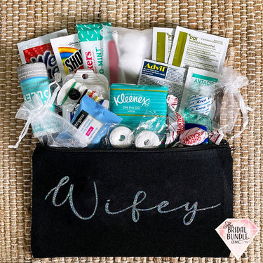 This (roughly 8.25×4.75) black canvas zipper bag comes with your color choice of glitter on the front saying “Wifey” in a thin script and comes either already stuffed with an array of the just-in-case products you or a member of your bridal party could use on your wedding day – Or empty and just as the bag itself.
