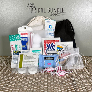 This drawstring comes in either a 5″x7″ blank cotton bag, or a 4″x6″ black Canvas Bag – and comes already stuffed with an array of the just-in-case products you or a member of your wedding party could use at the bachelorette party, the morning after, weekend away, or even on the wedding day.