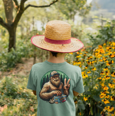 Bring a touch of humor and northern charm to your wardrobe with our "Peace Out" youth T-shirt from Nasty Northern. This Playful design features sasquatch, also known as bigfoot, wearing a trucker hat and flashing a peace sign in a whimsical, lighthearted manner. Set against a forested background complete with picnic items and a campfire, this design perfectly captures the friendly and quirky spirit of Northern Michigan.