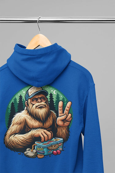 Stay cozy and show off your Northern charm with our "Lunch Break" Hooded Sweatshirt from Nasty Northern. This playful design features Sasquatch, also known as Bigfoot, wearing a trucker hat and flashing a peace sign in a humorous, lighthearted manner. Set against a forested background complete with picnic items and a campfire, this design perfectly captures the friendly and quirky spirit of Northern Michigan.