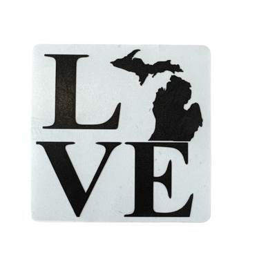Show off your Michigan pride with our 5-year laminated LOVE decal! This bold design features the word "LOVE" stacked vertically, with the "O" cleverly replaced by a silhouette of Michigan’s mitten and Upper Peninsula. Made for durability and outdoor use, it’s perfect for your car, laptop, water bottle, and more. Available in your choice of black or white, it's a simple yet powerful way to represent the Mitten State wherever you go!
