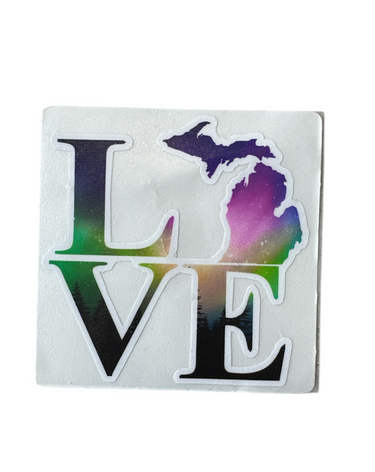 Show your Michigan pride with our stunning 5-year laminated LOVE decal! This unique design features the word “LOVE” stacked vertically, with the “O” replaced by a silhouette of Michigan’s mitten and Upper Peninsula. The entire design is filled with a breathtaking photo of the Northern Lights, bringing vibrant color and natural beauty to your space.
