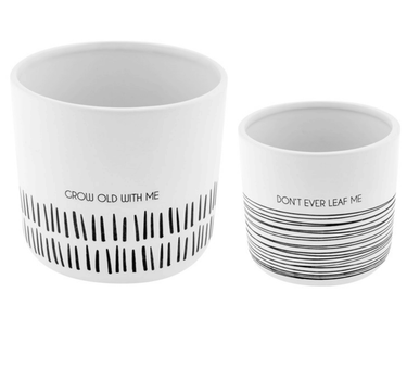 Milo Pots are made for holding the brightest of greens and the friendliest of flowers in their stoneware containers. These wax-resist designed pots feature charming words and simple but modern designs in black and white, allowing for them to blend with any decor style easily. Place inside or out and fill with potting mix and any plants or flowers to bring some life to your space.