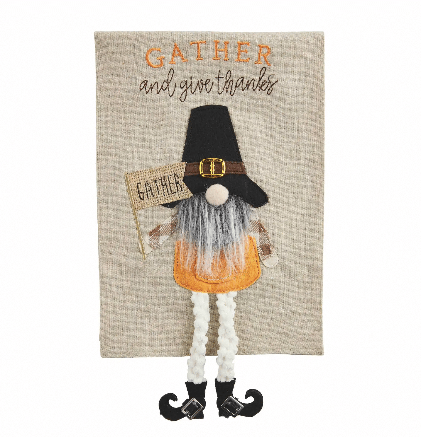 Gobble till you wobble with our Gather Gnome Thanksgiving Towel. The cotton hand towel features an embellished gnome applique. The gnome features knit dangle legs. The center of the towel has an image of a gnome wearing a pilgrim hat. The towel reads "gather and give thanks".
