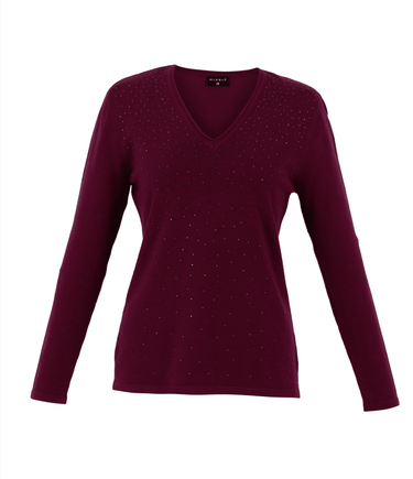 Introducing the Wild Berry Pink Bedazzled Sweater by Marble – a dazzling fusion of bold color and exquisite detailing that's sure to make a statement. This V-neck sweater combines a striking wild berry pink hue with a touch of glamour, featuring carefully placed rhinestones that catch the light and add a touch of sparkle.