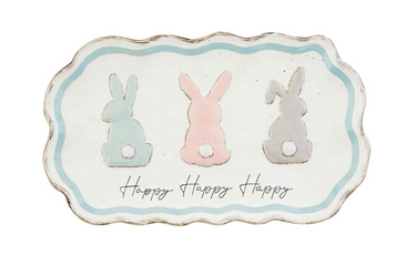 Our Bunny Trio Serving Platter is sure to deliver a whole lotta happy. The hand-painted speckled platter is made of stoneware. The platter features three bunnies - blue, pink and gray. The words "Happy Happy Happy" are featured beneath the bunnies. The platter features ruffle details on the edges.