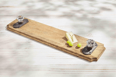 This Double Door Knob Board is a stunning serving piece for any event. The mango wood board features glass door knob handles on each side. This board makes the perfect decorative piece or serving piece. We recommend hand washing this board or cleaning with a damp cloth.
