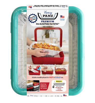 Make disposable foil pans fancy! Premium Fancy Panz Holders are taller and have a hot/cold pack to maintain food temperature. Freeze or boil the pack again and again.