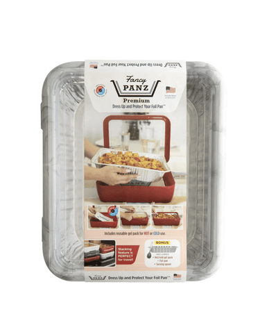 - WHAT IS A FANCY PANZ PREMIUM: Fancy Panz are used to dress up, protect and serve from a foil pan. Our premium version comes complete with a reusable Hot/Cold gel pack that can be frozen, boiled or microwaved and nestles between the base of your Fancy Panz and the bottom of your foil pan. Perfect for tailgating, potlucks, outdoor dining, picnics, home and more!