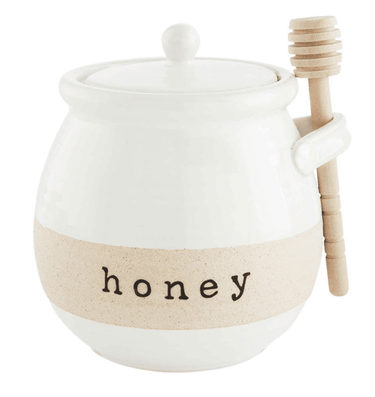 Dip into this Farmstead Honey Jar Set! The two piece set comes with a stoneware pot. The also pot features a lid that has a side loop to hold included wooden honey dipper. The front of the jar features the sentiment "honey" on the front. We recommend handwashing this set.