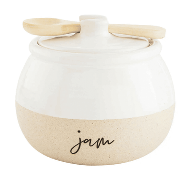 We've reinvented jam jars with our Farmstead Jam Jar Set. The two piece set comes with a stoneware jam jar with lid. The jar also comes with a wood spoon. The front of the jar features the sentiment "jam". We recommend handwashing this set after use to preserve the stoneware!