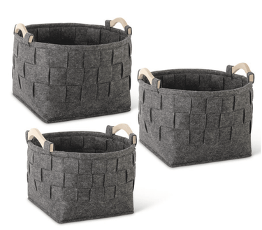 These Round Woven Grey Felt Nesting Baskets have a wooden handle. They are sold individually or as a set of 3 with one size of each.