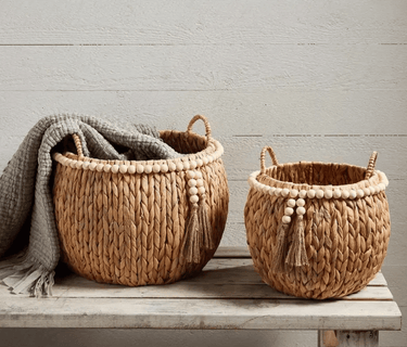 Our versatile beaded hyacinth baskets are the perfect accessory for your home. The baskets each feature side handles. The baskets also feature mango wood beads around rims with cotton tassels. The set comes with two baskets.