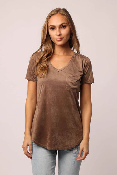 V-neck pocket tee finished with a curved hem. Perfect top for running errands or just a lazy day at home. Solid color brush knit on standard fit. Body length from HPS: 28", Sleeve length: 7", Bust: 37" (Size Small)