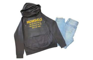 Introducing our Momsicle Navy Hoodie with Sunflower Print – the perfect blend of warmth, style, and mom love! This cozy navy funnel neck hoodie features a heartwarming message in sunflower-printed lettering. It proudly declares "Momsicle" on top, and underneath, it defines the term with love and humor: "One who sits at the field/rink and freezes for the love of her child."