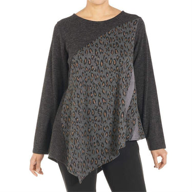 Fashion forward splicing of fabrics and print creates a stylish and on-trend tunic. Pair the Sansa Tunic with black denim and booties. Materials: Polyester/Viscose/Spandex.