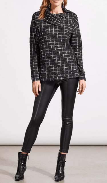 Long sleeve top in a dark black/ivory window pane pattern. Neckline has a folded over split neck with a zipper detail. Versatile piece that's a closet staple.
