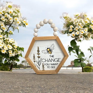 Add a touch of inspiration to your space with this charming 7” tall x 6” wide octagon-shaped hanging sign, designed to resemble a honeycomb. Featuring the uplifting message "The Change You Want to See" with a delicate bumblebee hovering above, this piece is a perfect reminder to embrace growth and positivity.