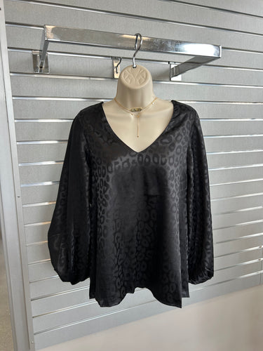 Turn heads with this effortlessly chic black satin blouse, featuring a subtle tonal leopard print for just the right amount of edge. The flowy, relaxed fit pairs perfectly with the deep V-neckline, giving you a flattering and feminine silhouette. Billowy sleeves with gentle gathers at the wrist add a touch of drama while keeping things elegant and comfortable.