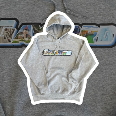 This comfy hoodie features “Gaylord” boldly printed across the front, with each letter showcasing a unique photo of a popular local landmark or attraction from our beloved Northern Michigan town. From scenic views to iconic spots, it’s like wearing a postcard from home.