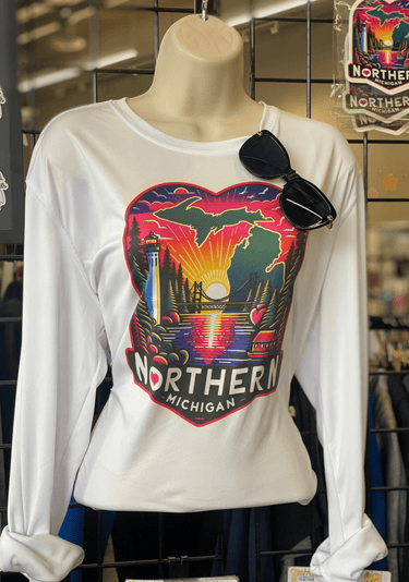 Stay Protected from the sun with this awesome Otsego Shores UPF 50+ shirt. Featuring A scenic view of a the lake at sunset with the mackinac bridge, this design is perfect for those who love what the northern lifestyle brings.