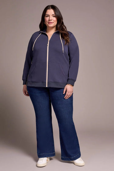 This Techno Lux Tribal Jacket features a sleek, casual design with a full front zip, drawstring neckline, and front patch pockets. Made for comfort and style, the jacket offers a relaxed fit in a soft, sapphire fabric accented with contrasting zipper and drawstrings. It's the perfect layering piece for a laid-back yet polished look.