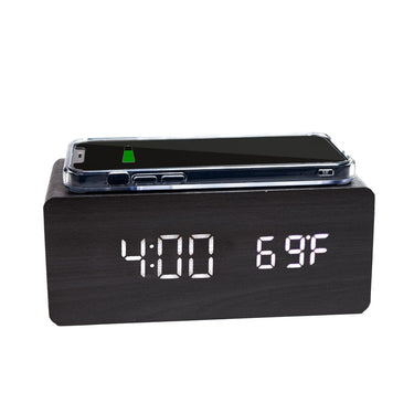 Alarm Clock/Wireless Charging Station features an LED time display with programmable alarm and wireless or USB charging options.