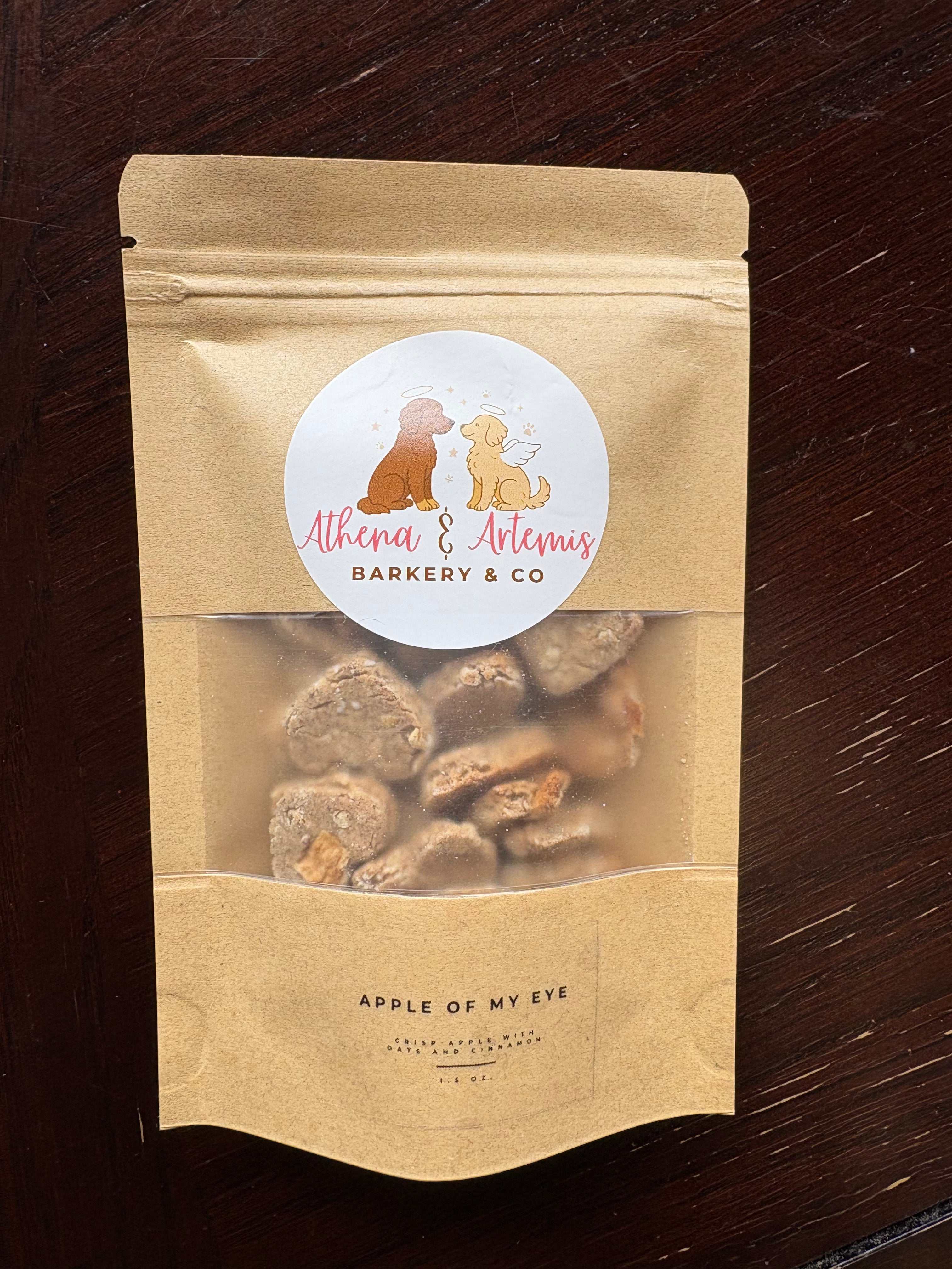 Made with oat flour. egg white. freeze-dried fuji apples (unsweetened), coconut oil, and cinnamon. Apple flavored dog treats.