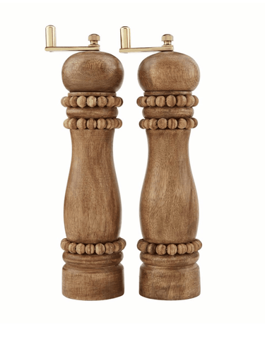 These beaded salt and pepper grinder set is classically chic. The set comes with two beaded mango wood salt and pepper grinders. The salt and pepper grinders features beaded details near the top and bottom of the grinder. The grinders also feature brass hardware. In order to use, remove top caps. The top part of the grinder will be able to be removed to add salt and pepper.