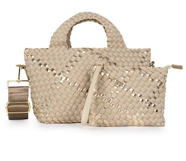Small size woven tote featuring zip top closure, lined interior with 1 slip and 1 zip pocket.