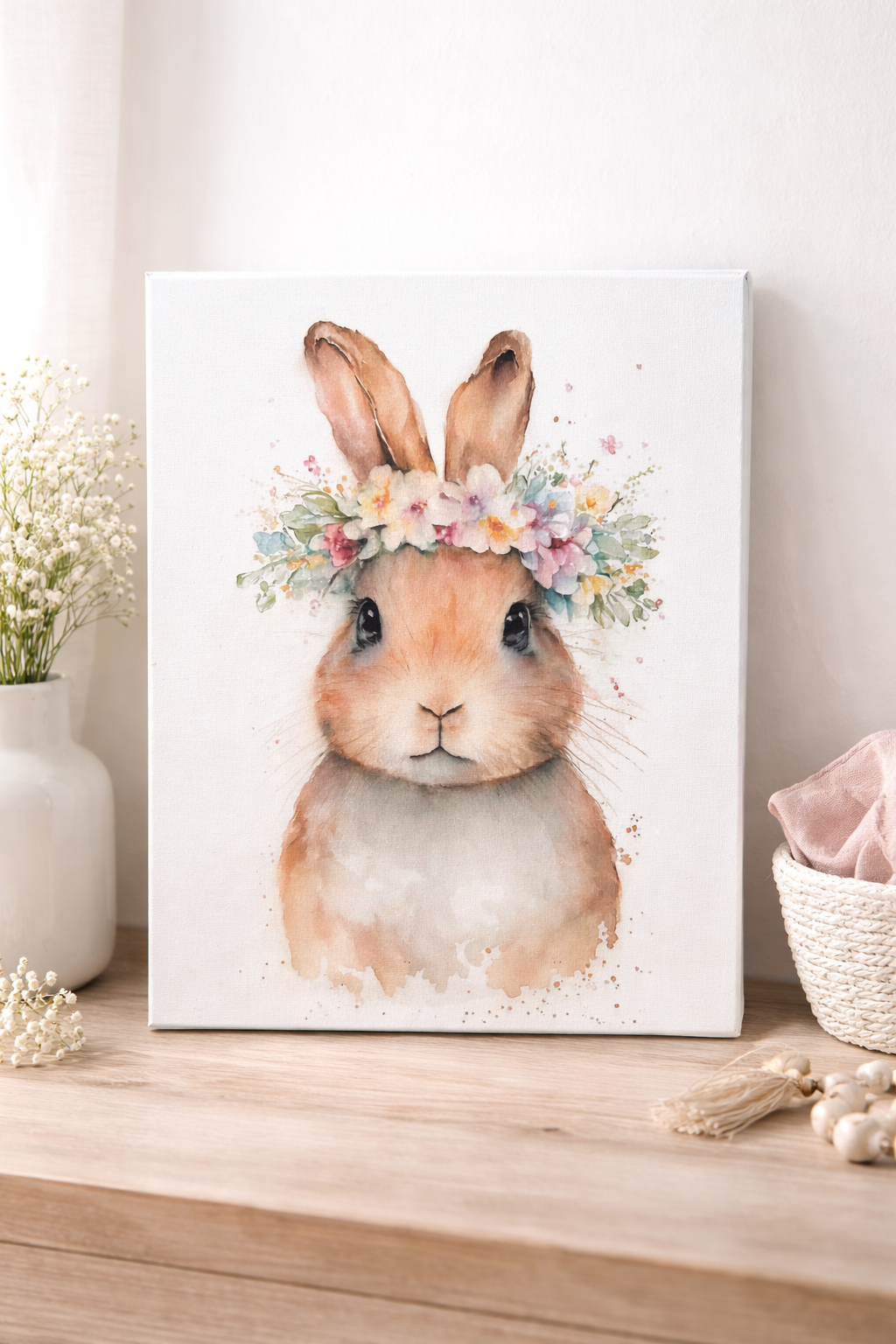Add a soft, whimsical touch to your spring décor with this adorable Floral Bunny Canvas. Featuring a sweet bunny wearing a delicate flower crown, this charming artwork blends soft watercolor tones with a gentle, nature inspired design that instantly brightens any space.