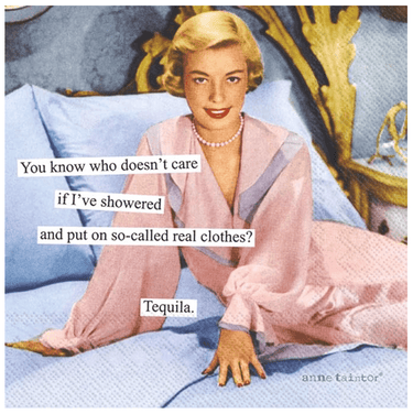 - FABULOUS RETRO DESIGN WITH A CLEVER ZINGER: 1950's hottie in a lovely pink robe; reads, "You know who doesn't care if I've showered and put on so-called real clothes? Tequila"