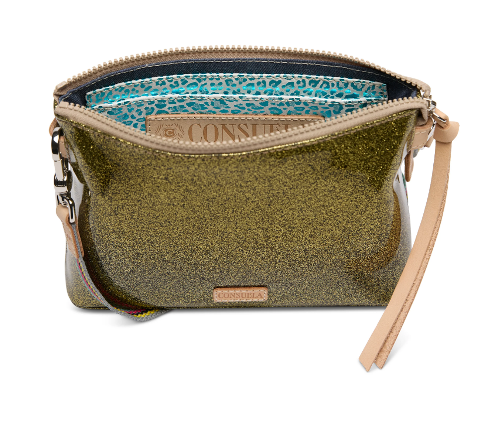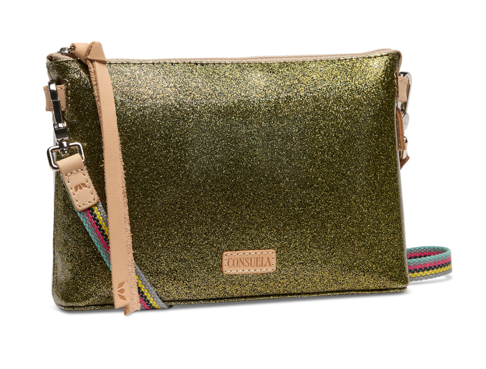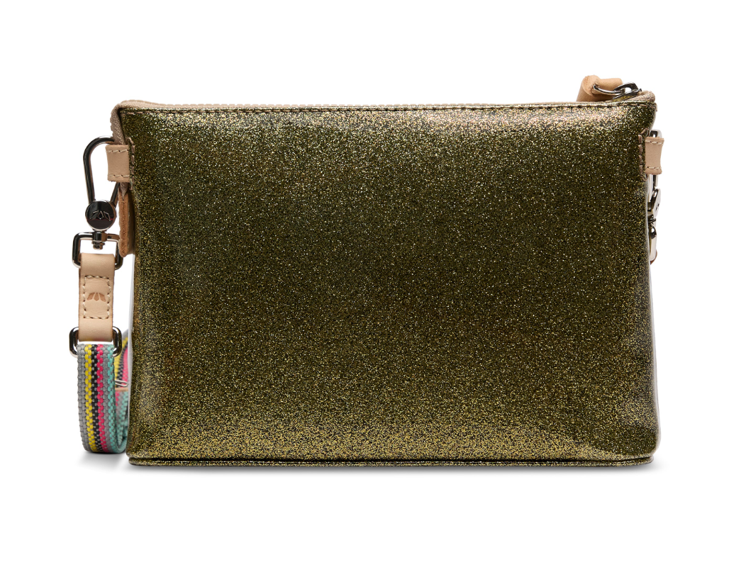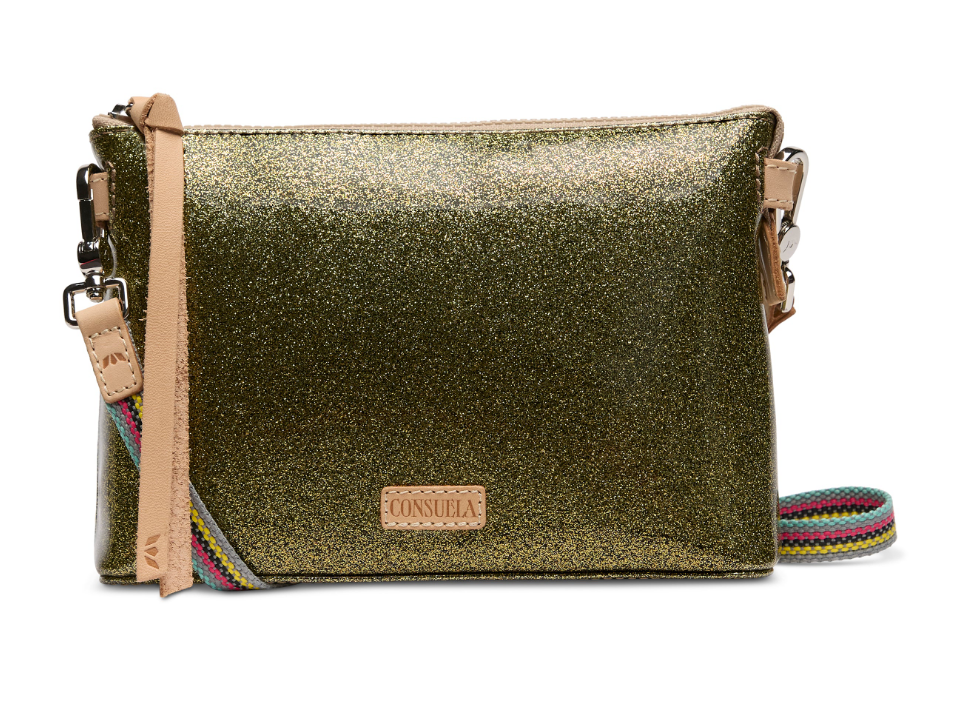 - 8 ¼" (W at the base), 9 ¼” (W at the top) x 5 ¾” (H) x 2" (D), 14 ½”-27 ½” adjustable crossbody strap drop