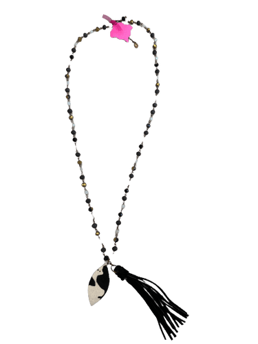 Multi Color beaded necklace with a cow hide pattern and black tassel.