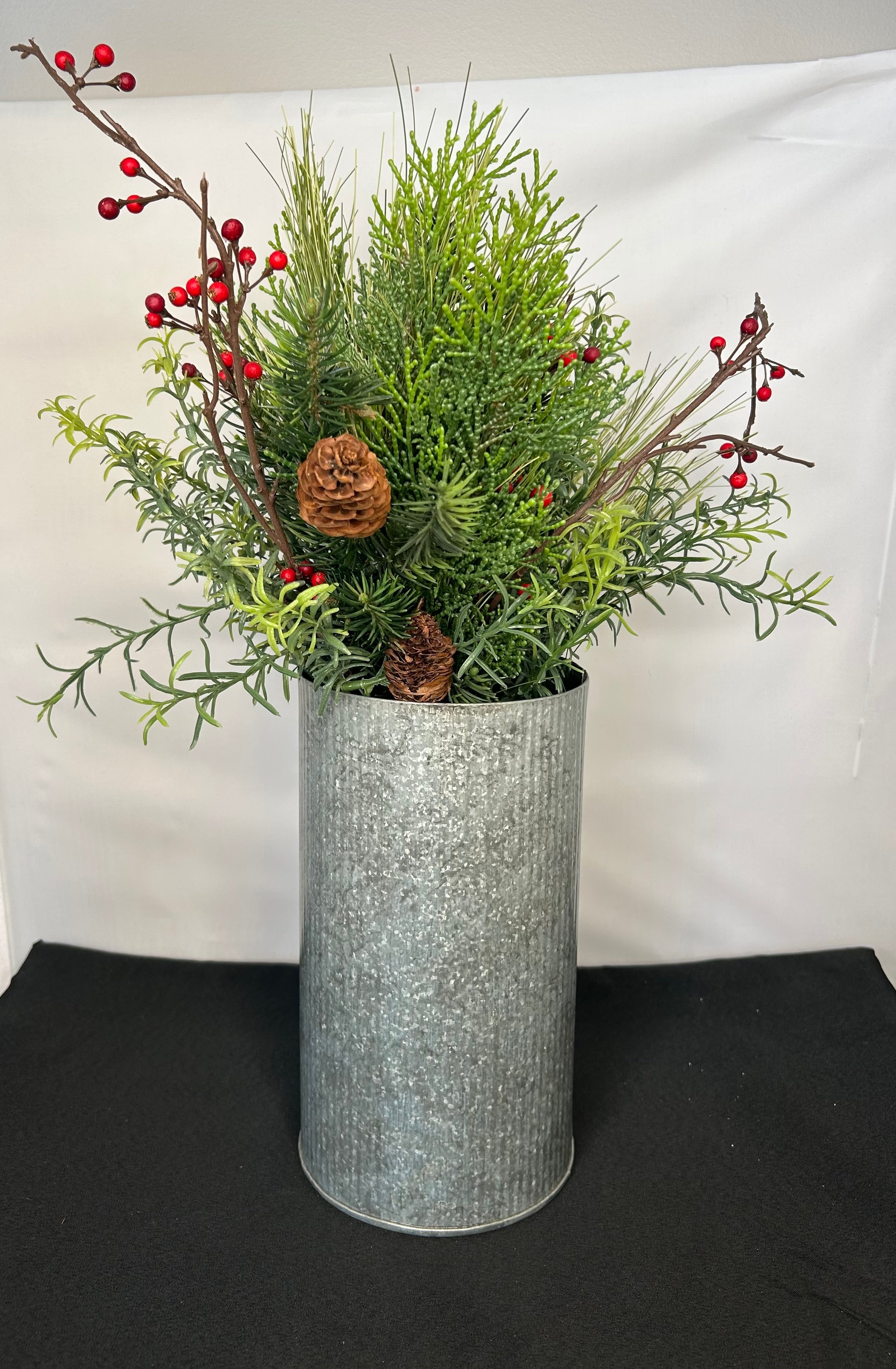 Bring a touch of rustic winter charm into your home with this beautiful greenery arrangement. Set in a tall galvanized metal vase, this piece features lush evergreen sprigs, bright red berries, and natural pinecones for that perfect festive feel.