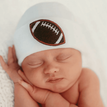 This ilybean White Football Newborn Boy Hospital Hat from ilybean is perfect for welcoming the newest football fan in your family. It is a great hat to pack in your hospital bag for the first photo shoot of the newborn baby boy. Handmade in the USA with a 2 ply fabric, it is also 2x's warmer and 2x's more cozy than the usual hats which are provided by hospitals. With the help of this hospital hat from Melondipity, you can help your little prince feel warm and look great. The Cozy Brown Chenille Football patch on the front makes this hat perfect for any football fans! With this uniquely designed hat, your little football lover can easily be identified in the hospital nursery. Melondipity is the only one that provides its hospital hats with a rounded top for a better fit.