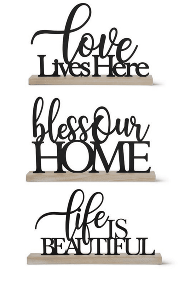 3 different metal tabletop signs with inspirational sayings.