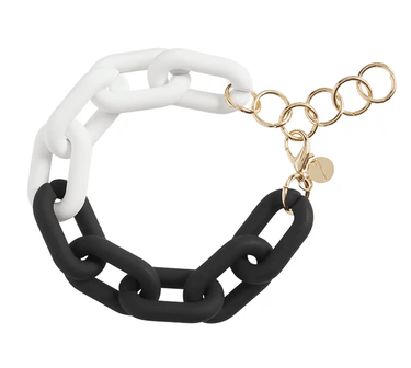 These Two Tone Link Bracelet are perfect for a night out on the town or party. The resin link bracelet features color block sections with black and white, pink and red, and navy and light blue coloring. The bracelet features a matte finish. This bracelet has an adjustable clasp, making it easy to find the perfect fit for you.