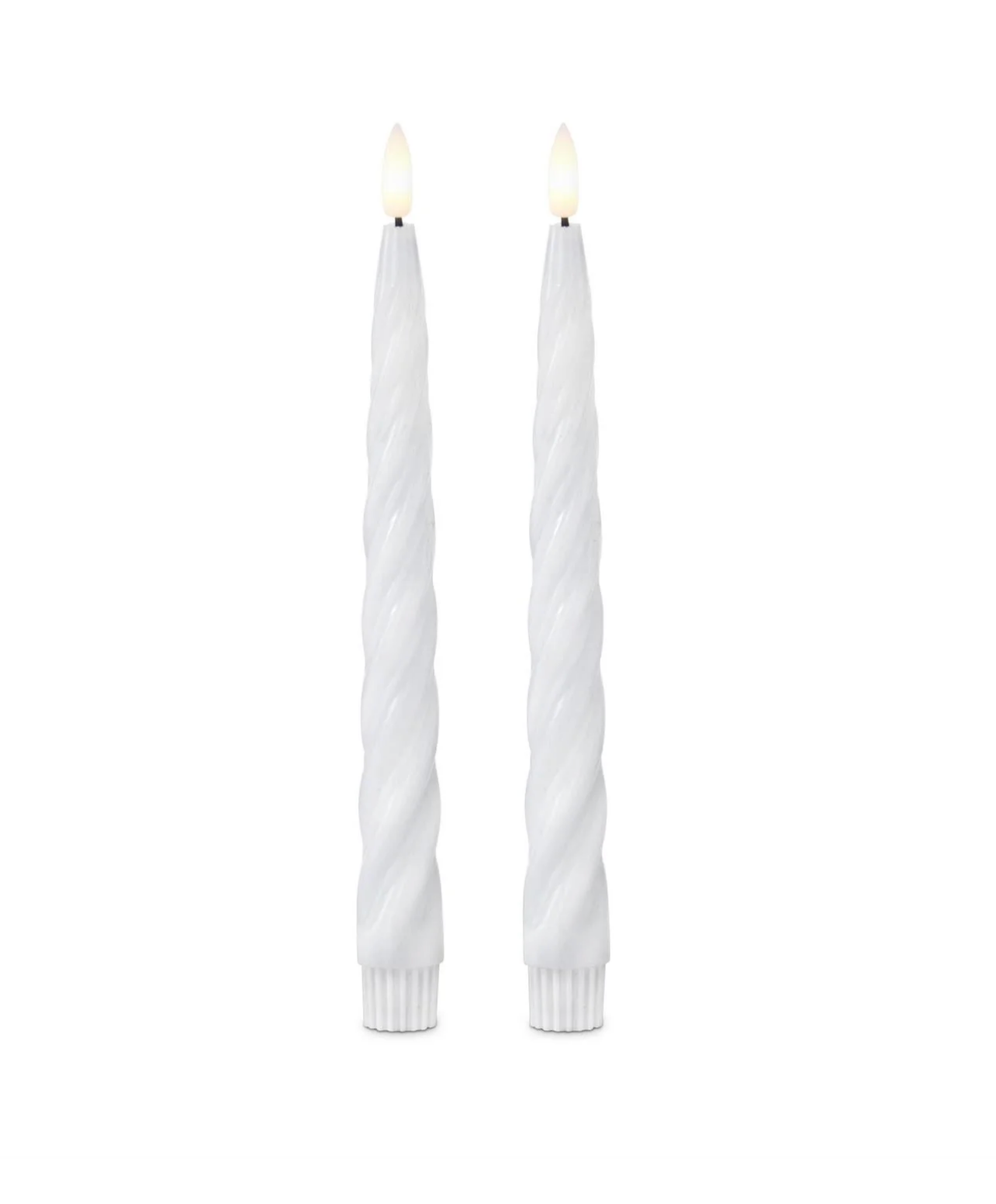 Elevate your holiday ambiance with this set of two 9.75" White Spiral LED Taper Candles. Their rich, festive color adds warmth and charm, while the realistic wax finish enhances their authentic look. Enjoy effortless convenience with an automatic timer that keeps them lit for 6 hours and off for 18, perfect for creating cozy evenings without any fuss. These candles bring festive spirit and safe, beautiful illumination to any space.
