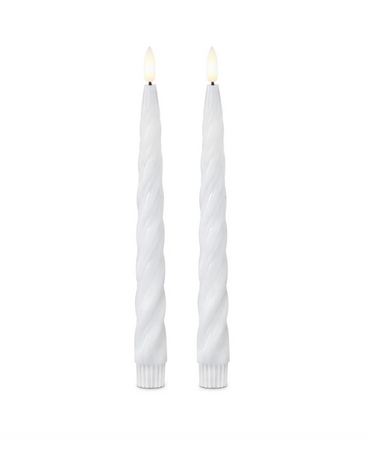 Elevate your holiday ambiance with this set of two 9.75" White Spiral LED Taper Candles. Their rich, festive color adds warmth and charm, while the realistic wax finish enhances their authentic look. Enjoy effortless convenience with an automatic timer that keeps them lit for 6 hours and off for 18, perfect for creating cozy evenings without any fuss. These candles bring festive spirit and safe, beautiful illumination to any space.